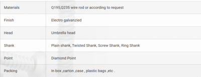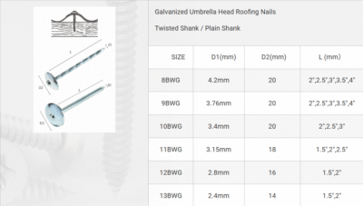伞形屋顶钉通常用于连接长度为4-8厘米的木质构件。主要材质为碳钢。